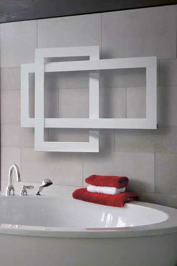 Radiator decorativ port-prosop electric, cu design geometric compus din forme dreptunghiulare și pătrate intersectate. Modelul CROSS se distinge printr-o structură deschisă, cu elemente suprapuse, care creează un efect vizual dinamic și echilibrat.
