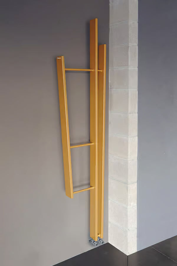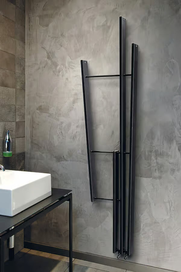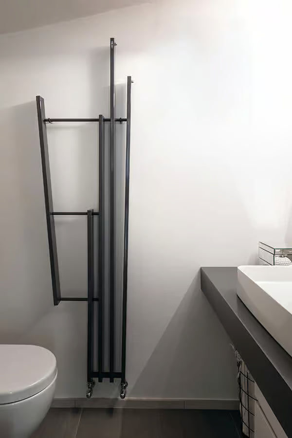 Structura compactă și liniile drepte transformă radiatorul într-un element arhitectural cu prezență vizuală puternică, fără a compromite funcția de încălzire și uscare a prosoapelor. Parte din colecția Lame, design Davide Brembilla.