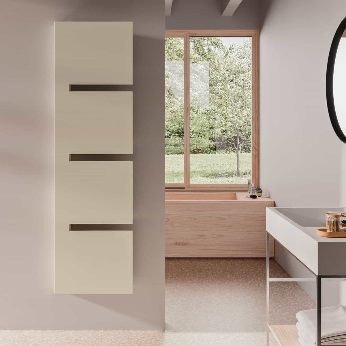 SEQUENZE este un radiator decorativ vertical, cu panouri plane și fante orizontale pentru distribuția uniformă a căldurii. Dispune de racordare hidraulică ascunsă, integrată în corpul radiatorului. Disponibil în două dimensiuni, cu puteri termice diferite, pentru adaptare la diverse spații.